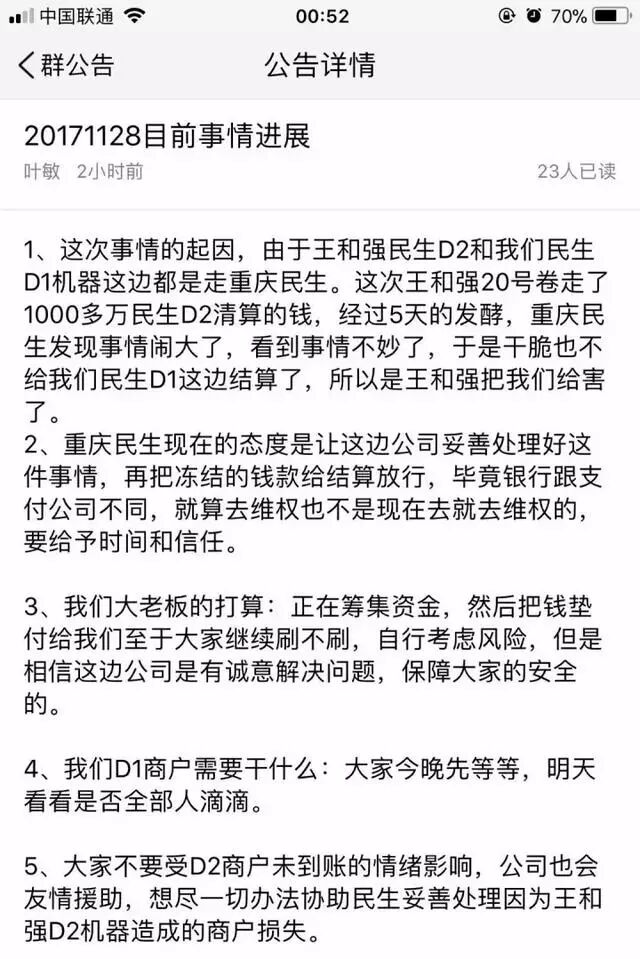眼看事情不妙,这家公司终于在群里把真相告诉了大家,资金迟迟未到账的原因并不是因为民生差错账的问题,实则是因为王和强卷走了1000多万民生D2清算的钱,声称他们也是受害者。